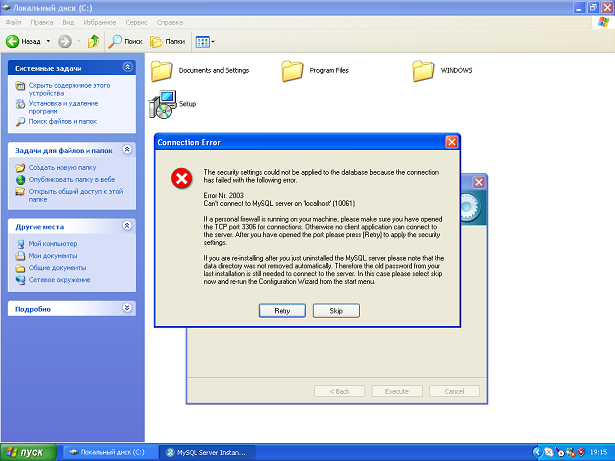 При установке MySQL высветилось окошко "Connection Error"