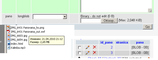 Здравствуйте.помогите пожалуйста..надо создать БД и в таблице хранить панорамы (flash файлы).. из размер в среднем выходит 3-5 Мб. пробовала поле longblob..но не хватает его...посоветуйте пожалуйста какой тип использовать и возможно ли такой файл хранить в базе.